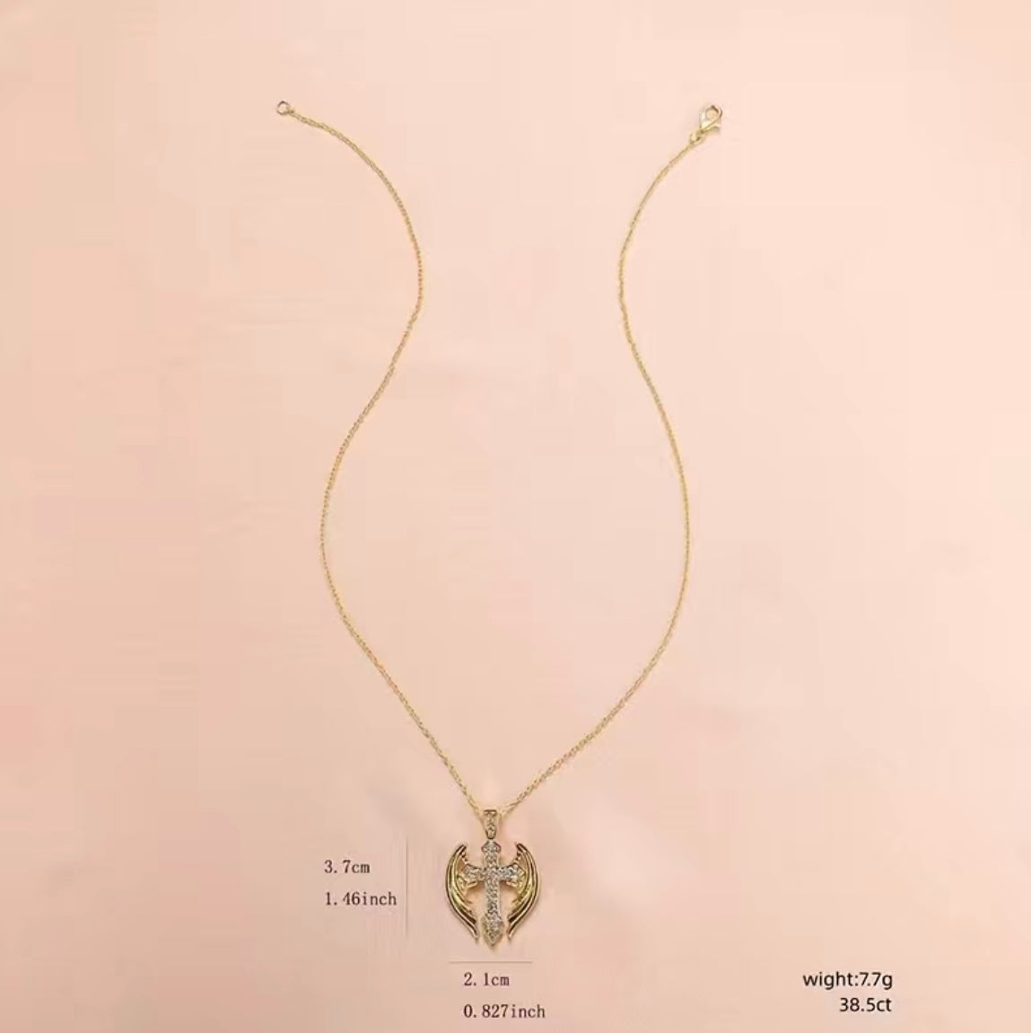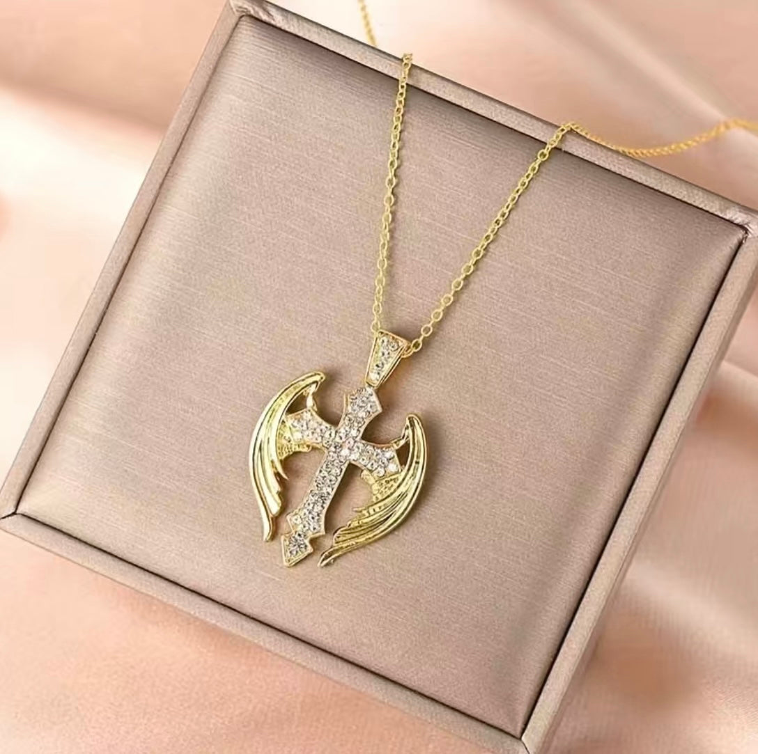 Custom Rhinestone Cross Pendant with Wings and Chain. Order now and enjoy a personalized and symbolic piece of jewelry that reflects your style and beliefs. Wear this pendant as a meaningful accessory or gift it to a loved one to make a lasting impression.