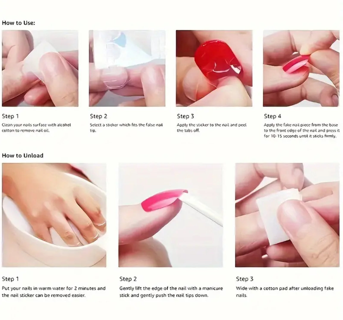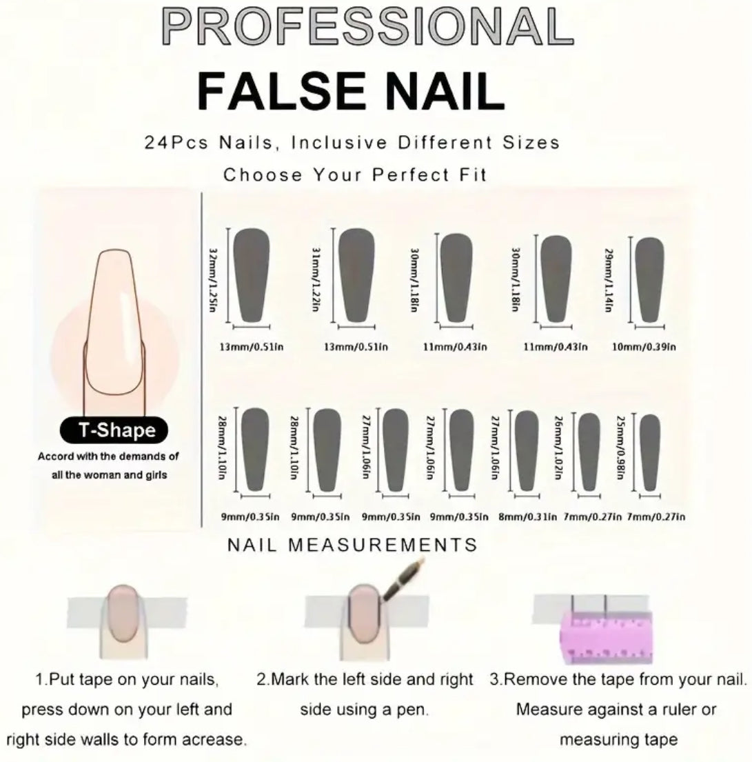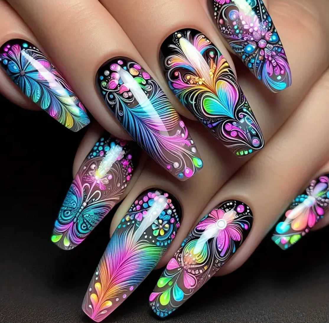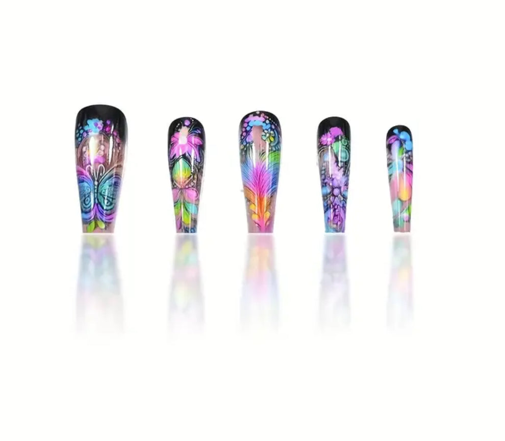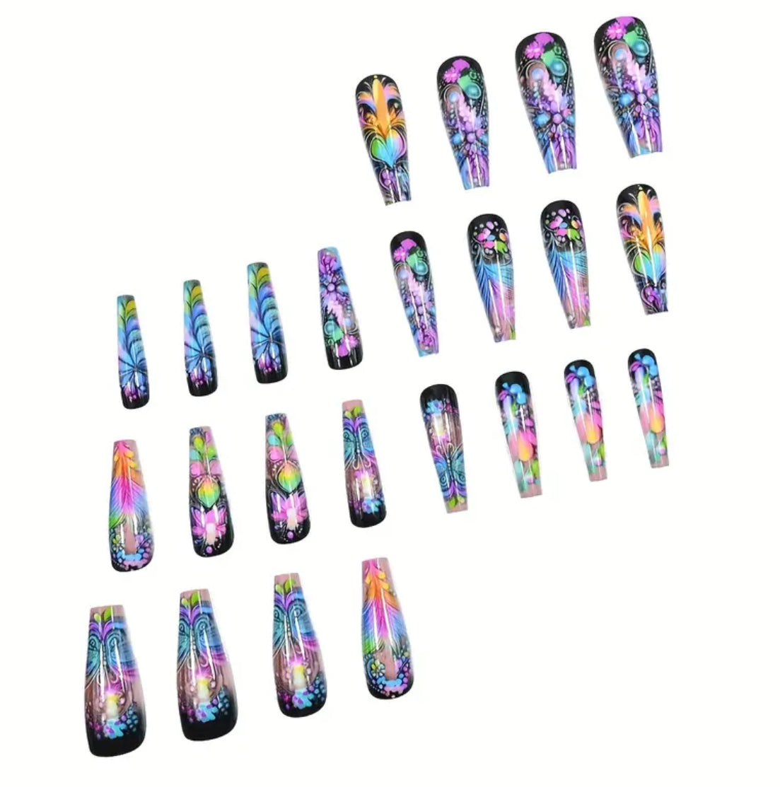 Full Set of 24 Long Ballet Shaped Fake Nails Mixed Color Design, Hearts, Feathers, Butterflies, Floral Design with a Glossy Finish Removable and reusable